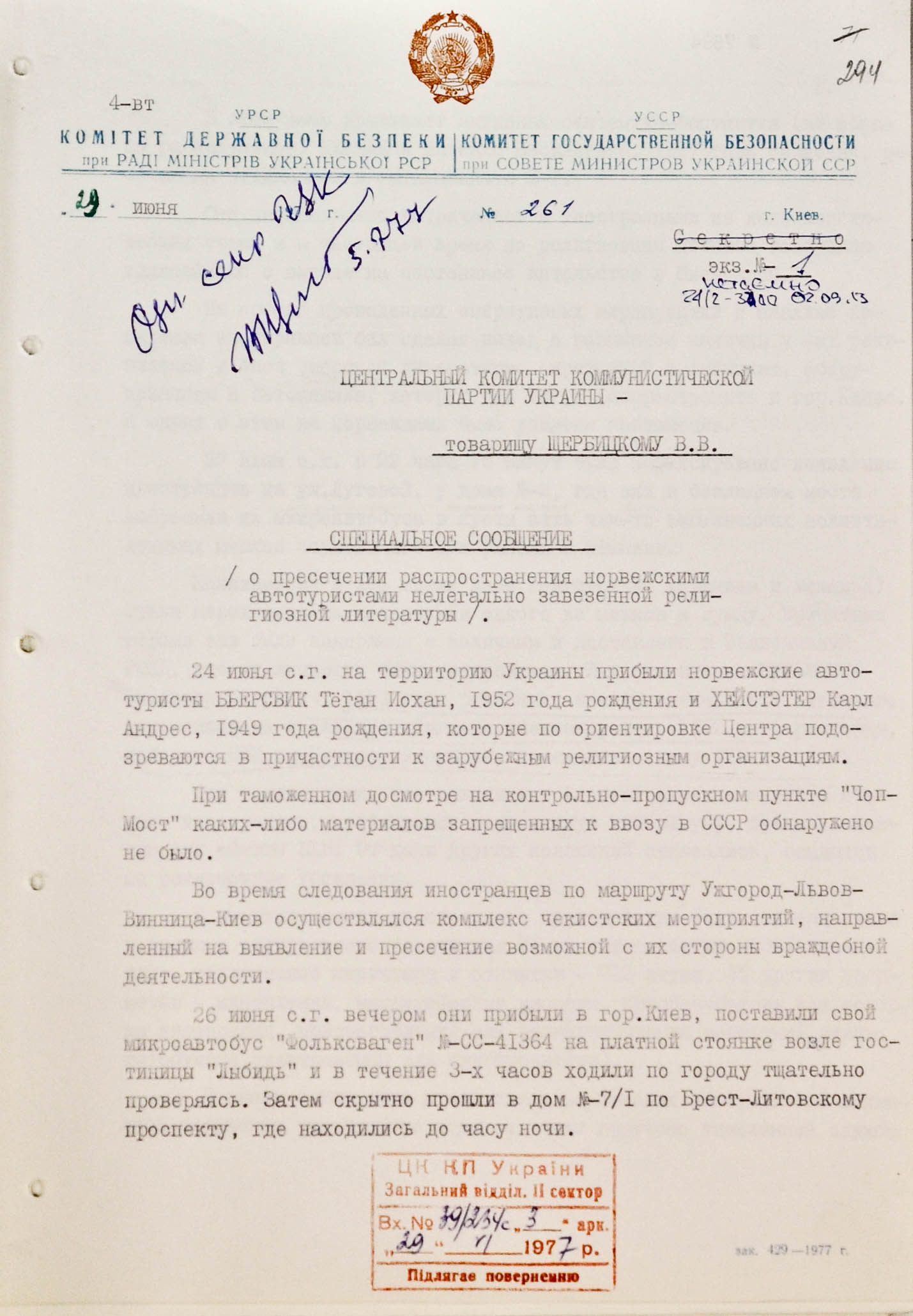 «To norske turister som ifølge meldinger fra Senteret er mistenkt for å tilhøre en fiendtlig religiøs organisasjon, ankom Ukrainas territorium den 24. juni i år,» het det i en rapport en uke senere fra KGB-sjef Vitalij Fedortsjuk i Kiev til det ukrainske kommunistpartiets generalsekretær, Volodomyr Scherbitzkij. «Under tollinspeksjon ved kontrollposten Chop ble det ikke funnet materiale som er forbudt å importere til Sovjetunionen. Under kjøreturen Ushorod – Kiev – Vinnitsa – Kiev ble omfattende kontraspionasje-tiltak derfor iverksatt med sikte på å avsløre og stoppe mulig fiendtlig aktivitet fra de reisendes side.»