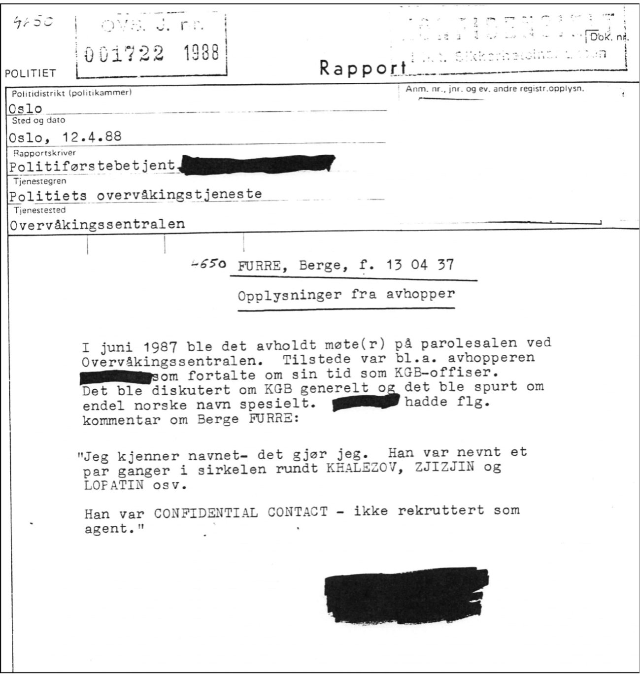 KONFIDENSIELL KONTAKT: Det fantes klare grunner til at Berge Furre var blitt opphøyet til konfidensiell kontakt i KGBs nettverk – og det gjaldt selvsagt ikke bare hans i ettertid ubegripelige offentlige omfavnelse av noen av historiens mest avskyelige regimer. Avhopperen Oleg Gordievsky (navnet sladdet av PST) arbeidet i skandinavisk avdeling ved Senteret i Moskva fra 1978, og kjente til Furres påvirkningsrolle – men ikke detaljene. Om han «hjalp» østblokkagentene med opplysninger om Misjon bak Jernteppet eller andre ideelle organisasjoner som kommunistene fryktet, er ukjent og vil neppe noensinne la seg bevise – om ikke SV selv finner ut at det er på tide å rydde partiets mørkeloft. Av de andre som er nevnt, bearbeidet Khalesov en annen SV-topp, redaktør Jan Otto Hauge, som regelmessig mottok penger fra sovjetiske KGB-offiserer (noe også en annen SV’er med jobb i NRK gjorde). Zjizjin førte Treholt i New York, mens Lopatin deltok i kultiveringen av Einar Førde. Faksimile av internt POT-notat.
