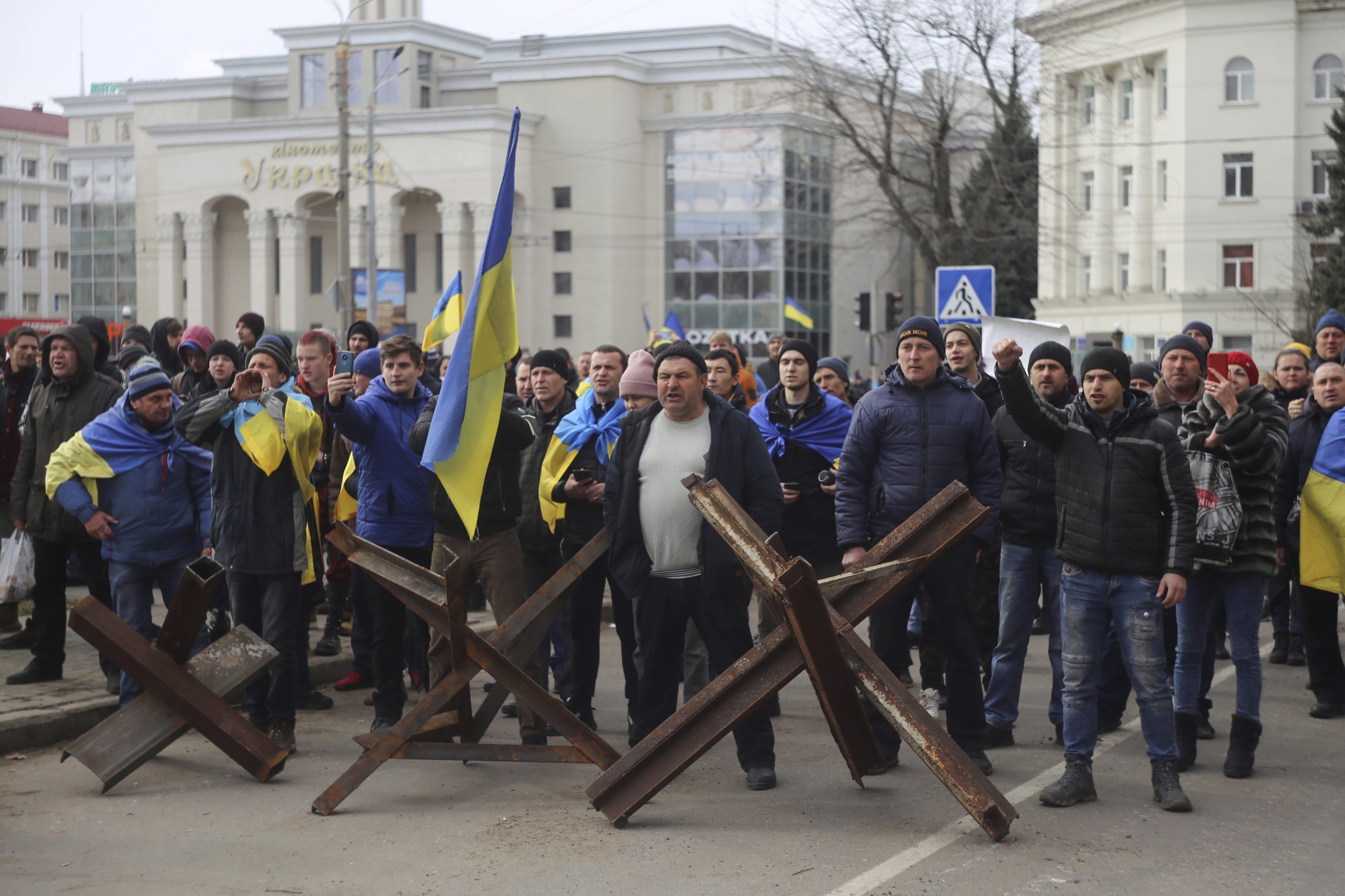 Det har vært flere demonstrasjoner mot de russiske okkupasjonsmyndighetene i Kherson, her fra frihetsplassen i Kherson 7. mars. Foto: Olexandr Chornyi / AP / NTB
