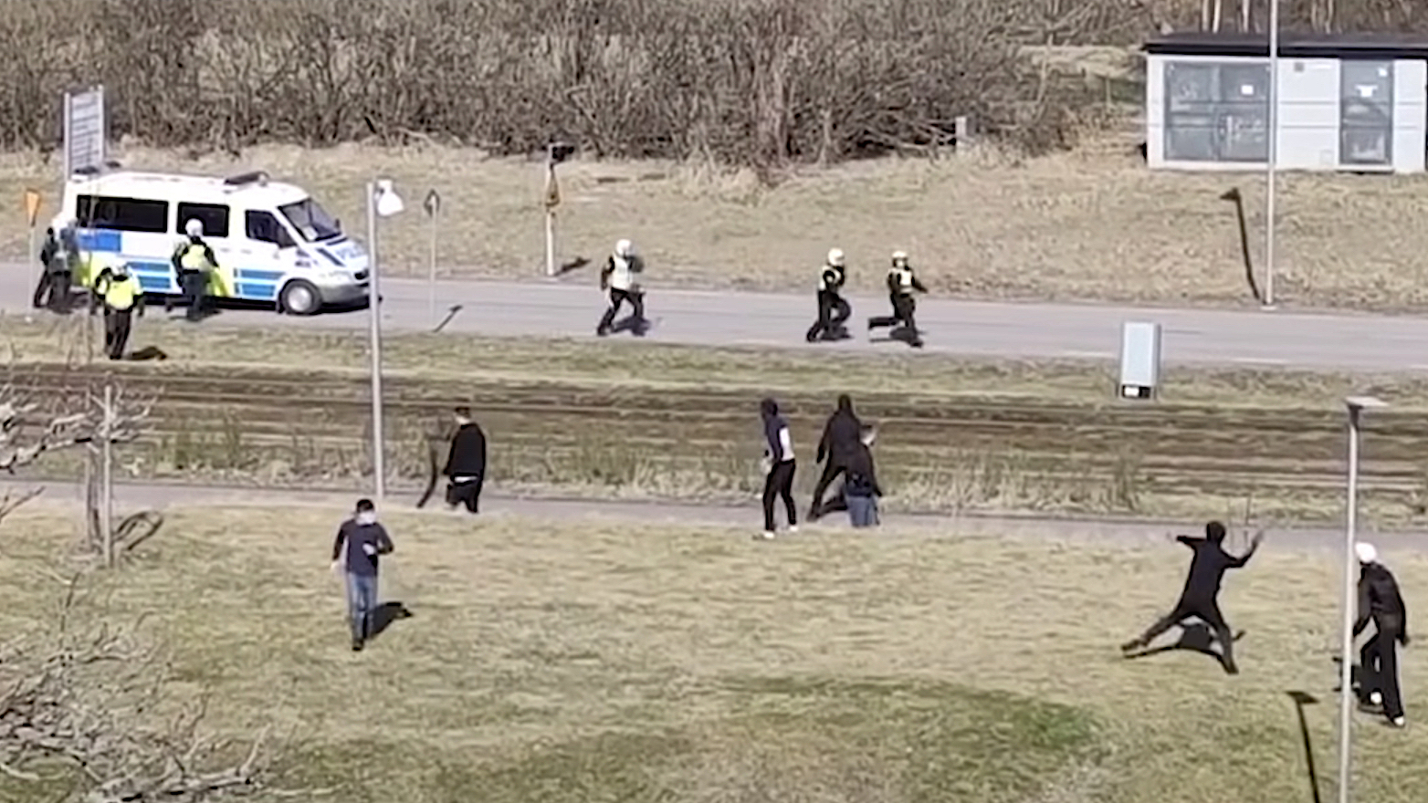 Voldelige demonstranter angriper politiet i Norrköping i april 2022. Stillbilde: Leservideo i Expressen.