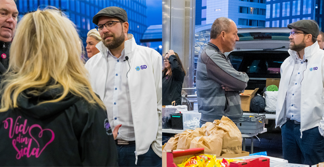 Søndag kveld hjalp Jimmie Åkesson til med matutdeling i regi av en gruppe som hjelper eldre hjemløse. Alle partiledere var invitert, men Jimmie Åkesson var den eneste som møtte opp.