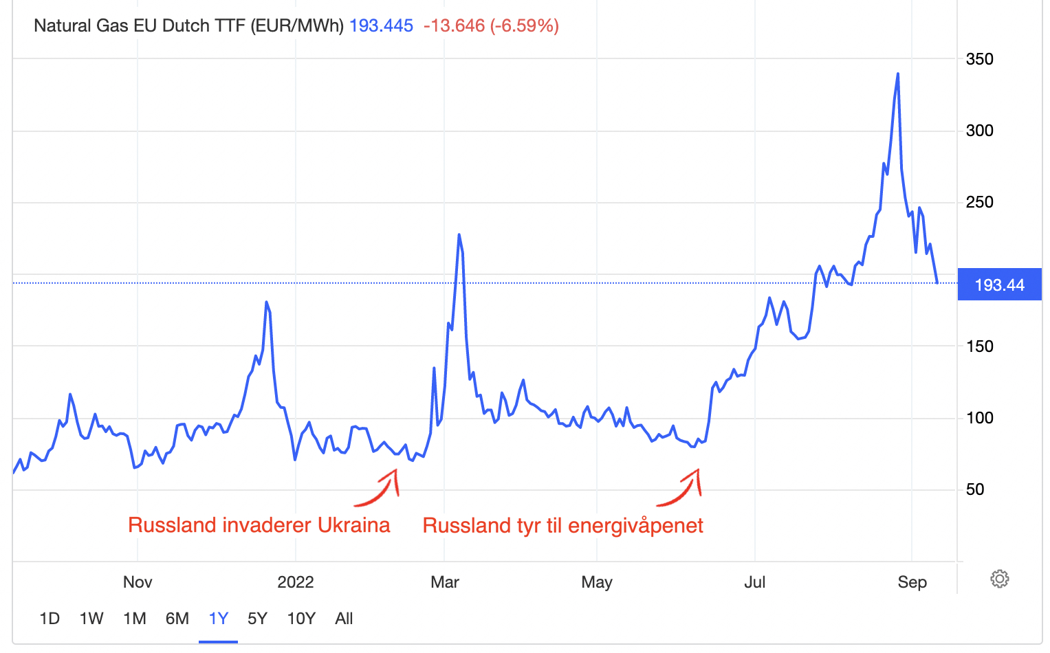 Fallet det er tale om, skjer uansett til et nivå som fremdeles er skyhøyt. Det siste årets utvikling i prisen på gass for fremtidig levering på TTF-børsen i Amsterdam ser slik ut: