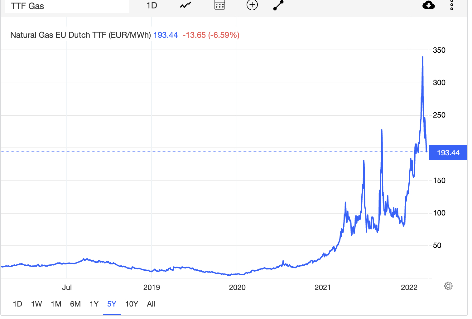 I skrivende stund er prisen litt over 190 euro/MWh, som altså er mer enn tre ganger dét igjen. Med andre ord koster gassen i øyeblikket omtrent ti ganger så mye som for fem år siden, og det influerer også på strømprisen.