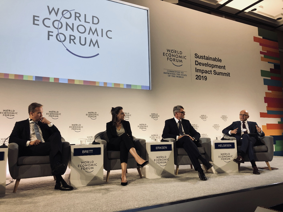 Med mer enn 100 millioner i årlige driftskostnader for REV Ocean har Røkke satset sterkt på FN og de som sitter på globalismens pengesekker, som World Economic Forum (WEF) i Davos. Her møter Akers adm. direktør Øyvind Eriksen (nr. 3 fra venstre) to av nordmennene som bærer et tungt ansvar for det grønne skiftets misere, Høyre-politikeren Børge Brende (t.v.) og Erna Solbergs tidligere koffertbærer, Vidar Helgesen (t.h). Hvilke økonomiske løfter som ble avgitt – om noen i det hele tatt – er ukjent. Foto: REV Ocean.