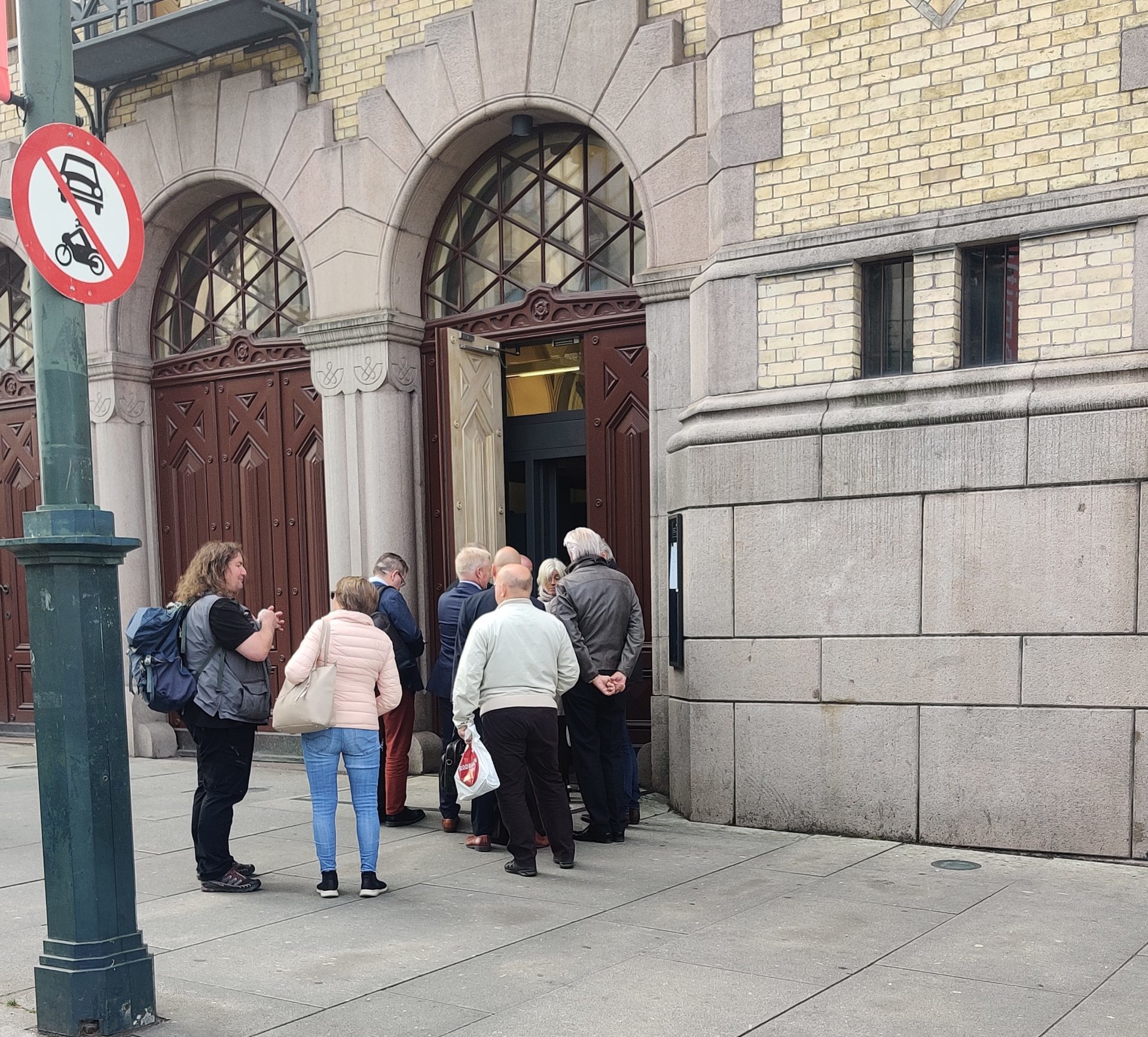 Kø var det også på andre siden av gaten. Den køen var betydelig lengre. Der sto minst et hundretalls mennesker, svært mange av dem av utenlandsk avstamning i kø for å komme inne på DnBs filial. Kanskje de har forstått at høsten blir lang og tøff, og at bankene nødvendigvis ikke er det tryggeste sted å oppbevare sparepengene.
