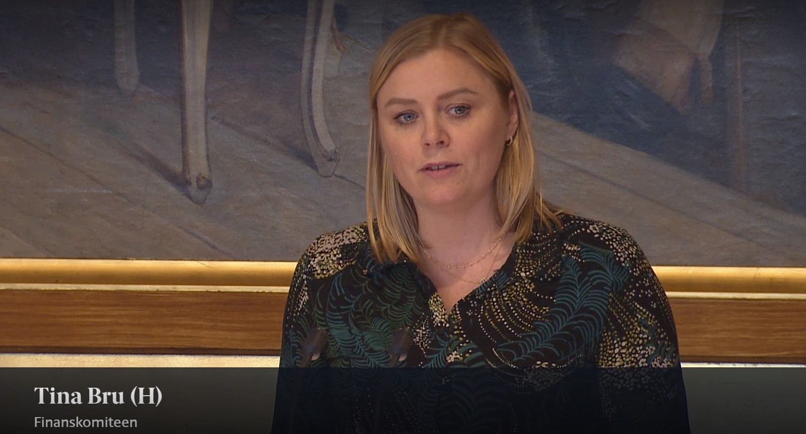 Tina Bru (H) gjentok den velbrukte frasen om at Putin og krigen i Ukraina har skylden for de høye strømprisene under sitt innlegh i mandagens strømdebatt på Stortinget. Skjermdump: Stortinget