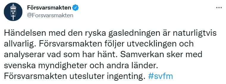 Ifølge svensk og dansk informasjon er det trolig sabotasje som ligger bak lekkasjen fra Nord Stream 1 og 2 .