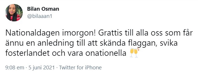 Datteren, Bilan Osman, er født i Sverige, men er allikevel en sterk forkjemper for hijab. Hun bruker sin journalistutdannelse og jobb til å fortelle hvor diskriminert hun har vært (er) og hvor fæle svensker er. Særlig de som stemmer på Sverigedemokraterna.