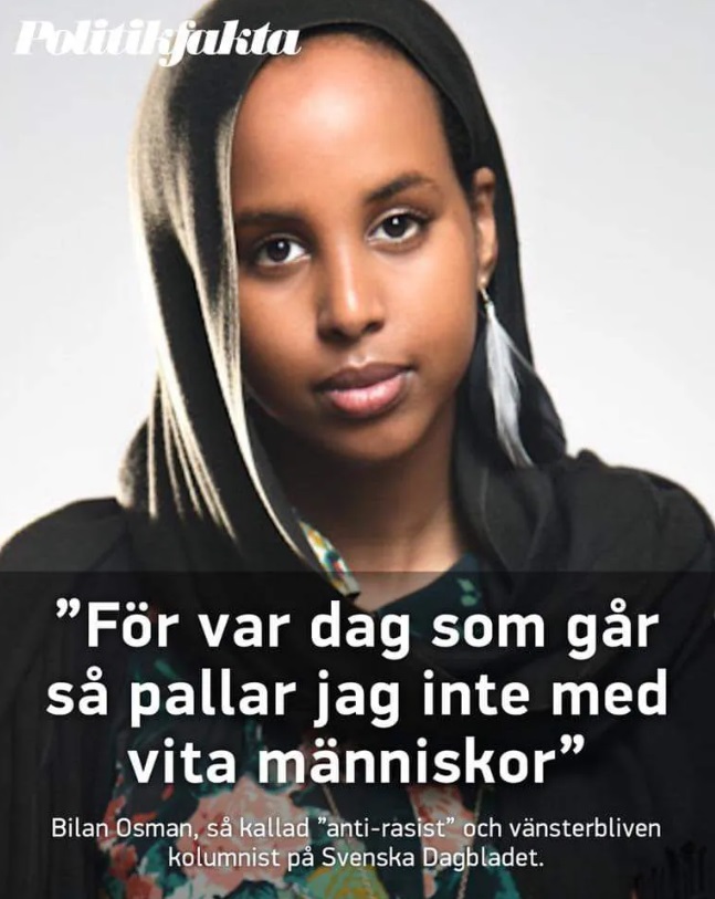 Bilan Osman mener at det er viktig å prate om «hvithet» i Sverige i dag. På samme måte som det er viktig for feminister å også prate om menn, sier hun. Ja, vi ser hvilken ovenifra-og-ned-holdning som serveres til svensker som ikke pisker seg selv nok for sin «hvithet».