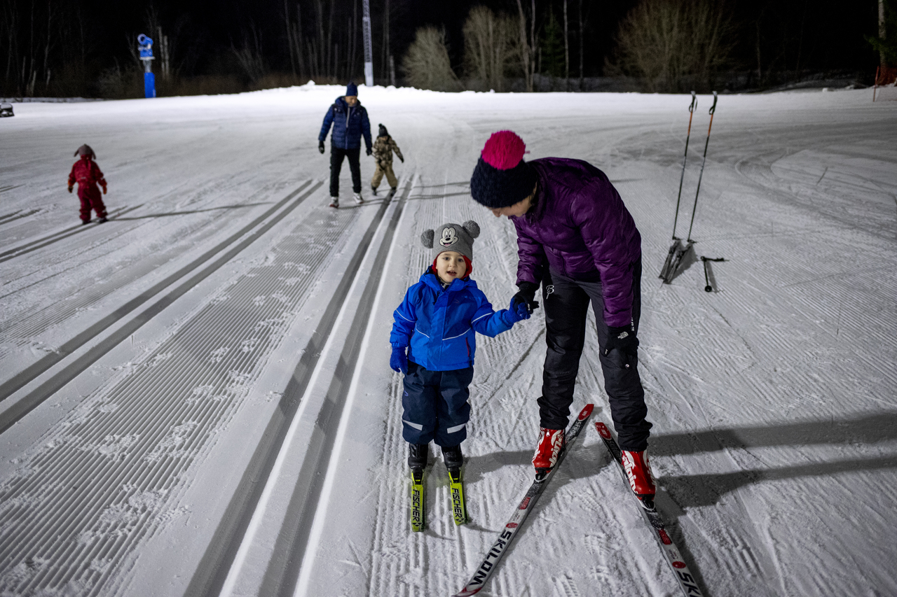 Stefan Veljkovic (2) og Mirjana Veljkovic (37), familie på skitur med barna, som lærer å gå på ski på Nøklevann.