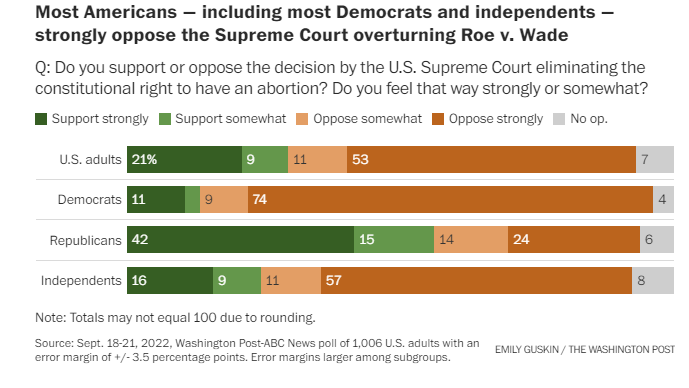 Mellomvalget i USA den 8. november blir tilsynelatende jevnt, men meningsmålinger synes å vise et lite Republikansk overtak. Velgerne er nå mer opptatt av saker der Republikanerne har høy troverdighet – som økonomi og innvandring. Biden er et handikap for Demokratene, og abortsaken det samme for Republikanerne, men velgerne virker nå mindre interessert i abortspørsmål enn økonomi.