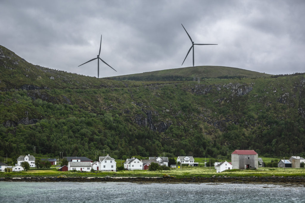 Vindturbiner tilhørende Haram vindkraftverk på fjellet over tettstedet Ulla på Haramsøya i Ålesund kommune. Foto: Halvard Alvik / NTB.