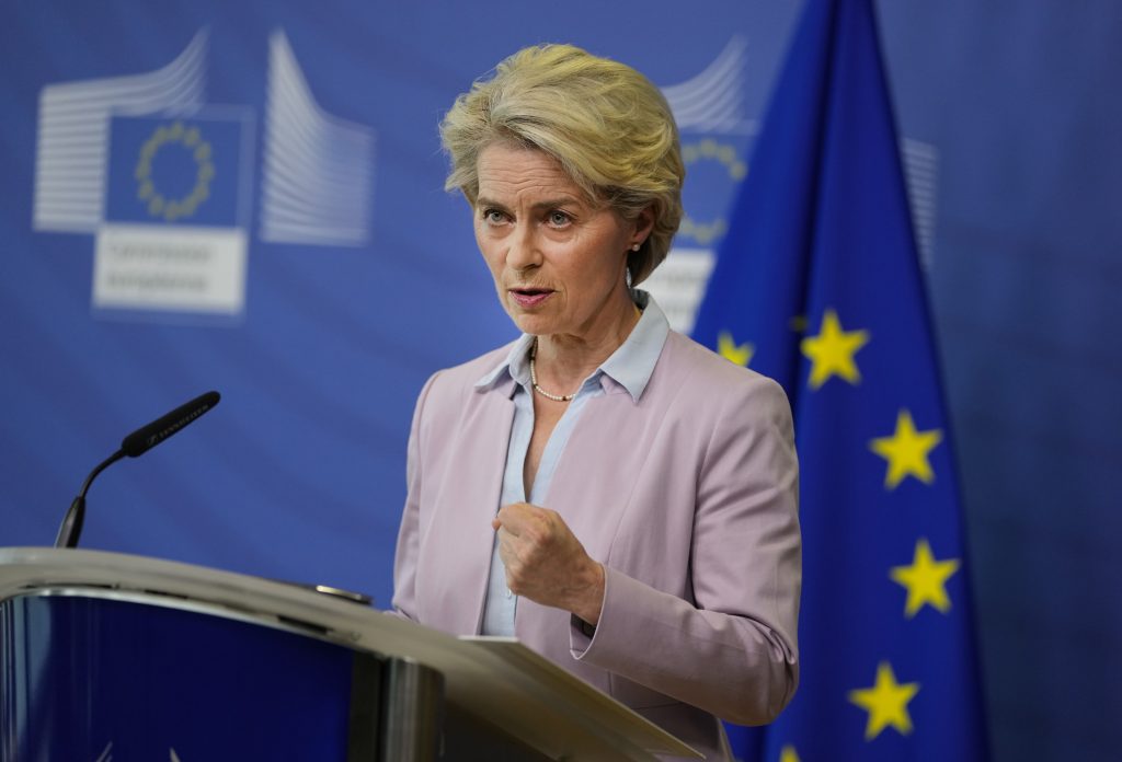 Venstre-leder Melby tar til orde for at Norge skal gå «all in» i EU, her representert ved European Commission President Ursula von der Leyen. (AP Photo/Virginia Mayo/NTB)