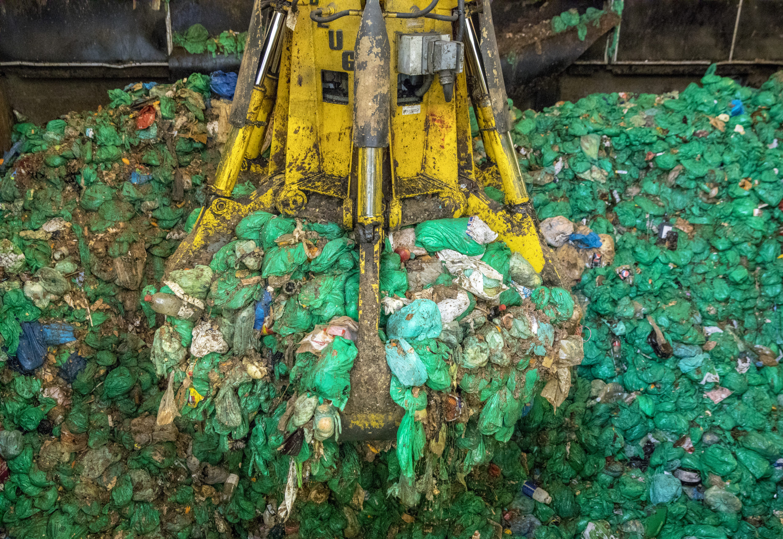 Matavfall (de grønne plastposene) fra «flinke» Oslo-innbyggere som lydig er med på kildesorteringen. Foto: Ole Berg-Rusten / NTB