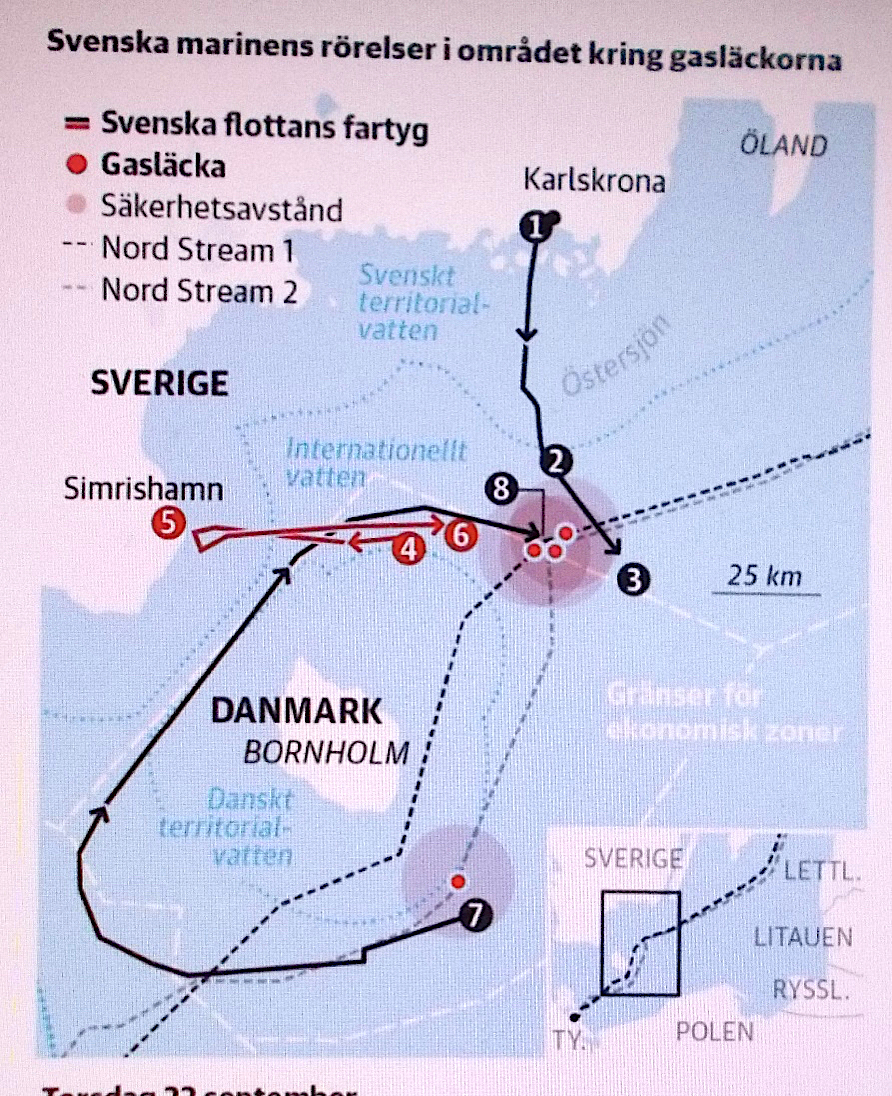 Endelig viser det seg, ifølge undersøkelser Dagens Nyheter har gjort, at tre svenske marinefartøyer tilsynelatende uforklarlig oppholdt seg over åstedene ved Bornholm i dagene rett før eksplosjonen – torsdag til lørdag 24. september.