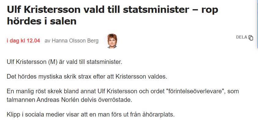 Ulf Kristersson fra Moderaterna ble som ventet valgt til ny statsminister da Riksdagen mandag ble samlet til avstemning. Det mest dramatiske var da en publikummer kom med et «mystisk skrik» rett etter at avstemningen var ferdig, skriver Aftonbladet.