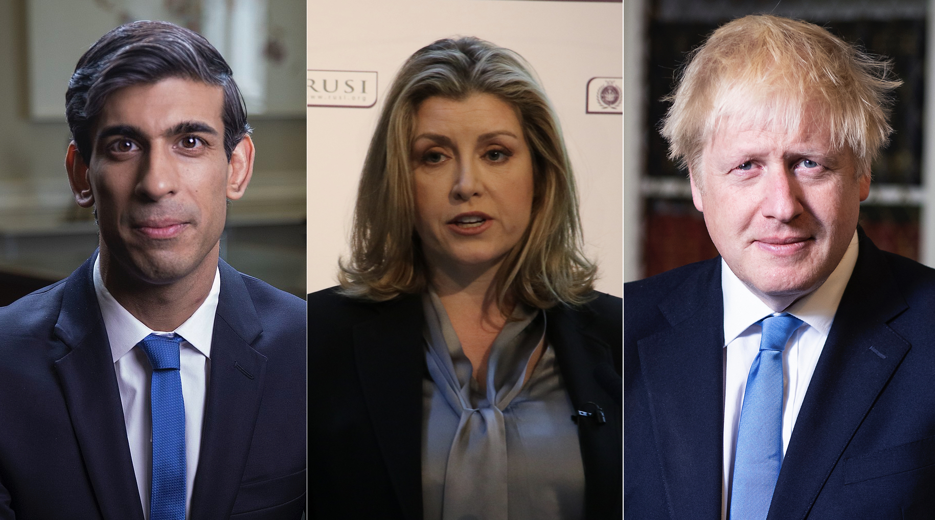 Rishi Sunak, Penny Mordaunt og Boris Johnson. Blir en av disse ny statsminister i Storbritannia? Foto: Simon Walker / HM Treasury, Royal United Services Institute og Ben Shread / Cabinet Office – alle via Wikimedia.