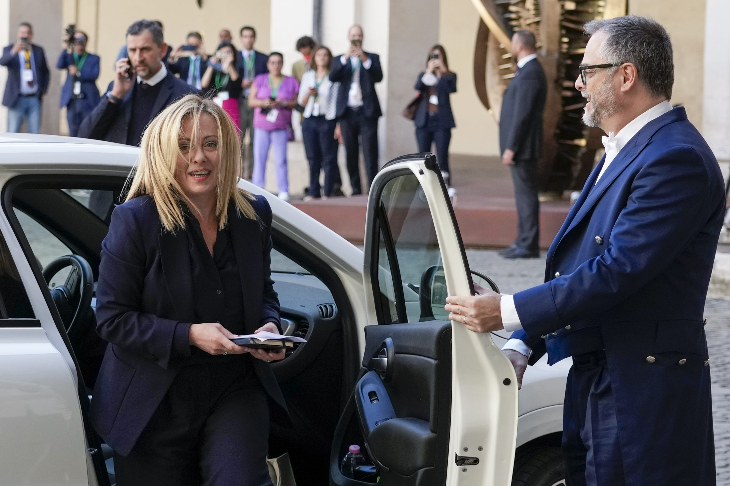 Meloni ankom presidentpalasset i sin egen hvite Fiat 500, et stilvalg som er uvanlig ved slike anledninger, hvor det gjerne er de største limousinene som gjelder. FdI-lederen ønsker utvilsomt å signalisere en smule nøkternhet i en tid hvor mange sliter økonomisk.
