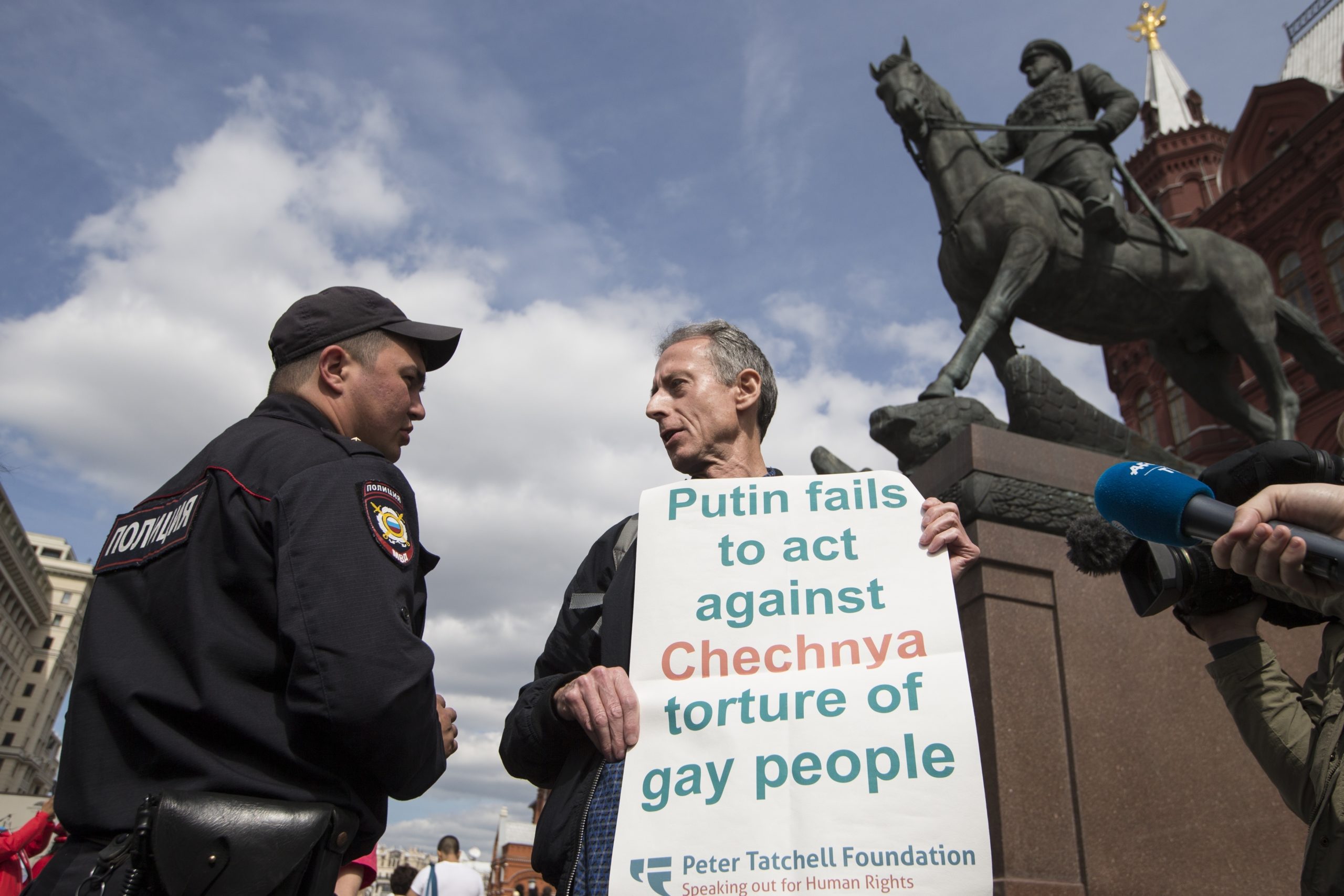 LHBT-aktivisten Peter Tatchell mangler i det minste ikke mot. Her under en demonstrasjon på Den røde plass i Moskva. (AP Photo/Alexander Zemlianichenko)