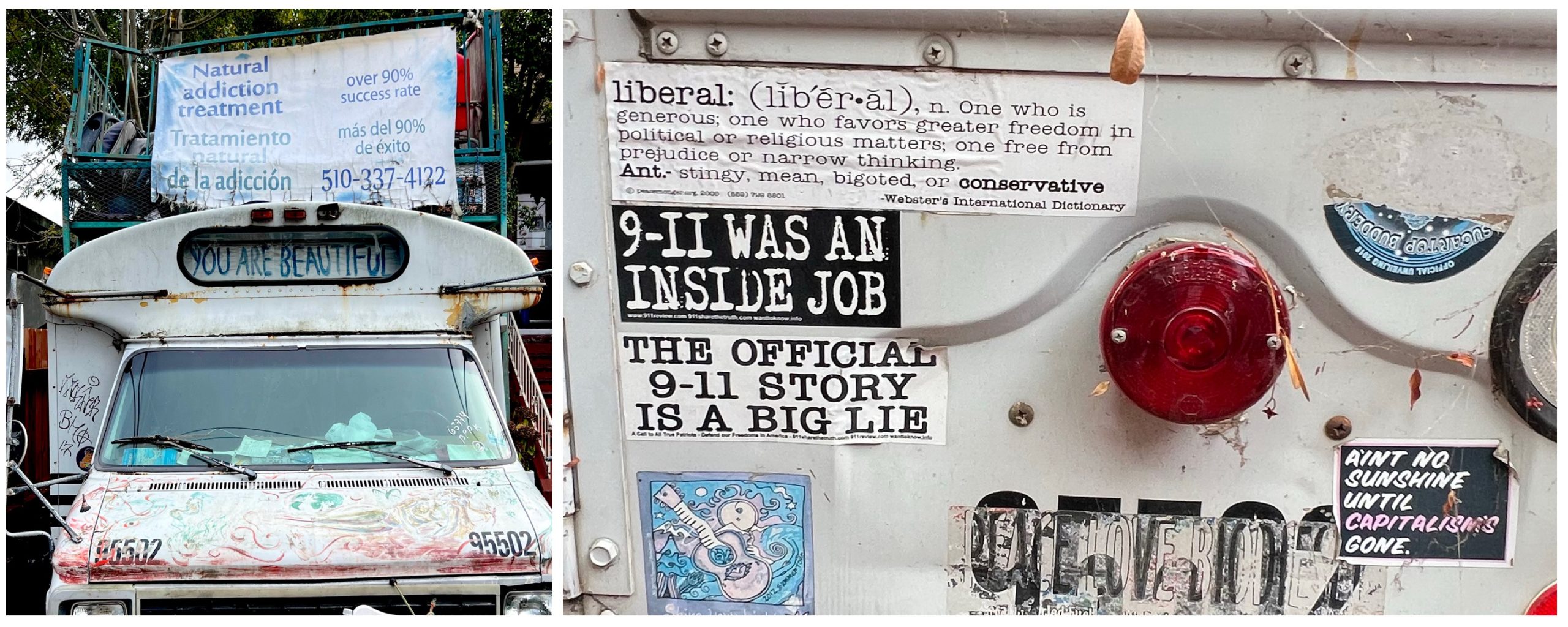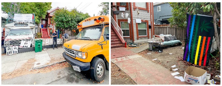 Og, som jeg oppdaget i går, bodde DePape sammen med en beryktet lokal nudist i et Berkeley-hjem, komplett med et Black Lives Matter-skilt i vinduet og et LHBT-regnbueflagg, utsmykket med et marihuana-symbol, hengende fra et tre. En nærmere titt avslører egenskapene til en hjemløs leir, eller det europeere kaller «en åpen narkotikascene». I oppkjørselen står det en havarert bobil. På gaten står en gul skolebuss som naboer sa at DePape av og til oppholdt seg i. Begge er fylt med søppel, noe som er typisk for hjemløse i slike leirer. Folk kommer og går fra huset og kjøretøyene, sier naboer, delvis for å ta del i bruken av et sterkt psykedelisk stoff, ibogaine.