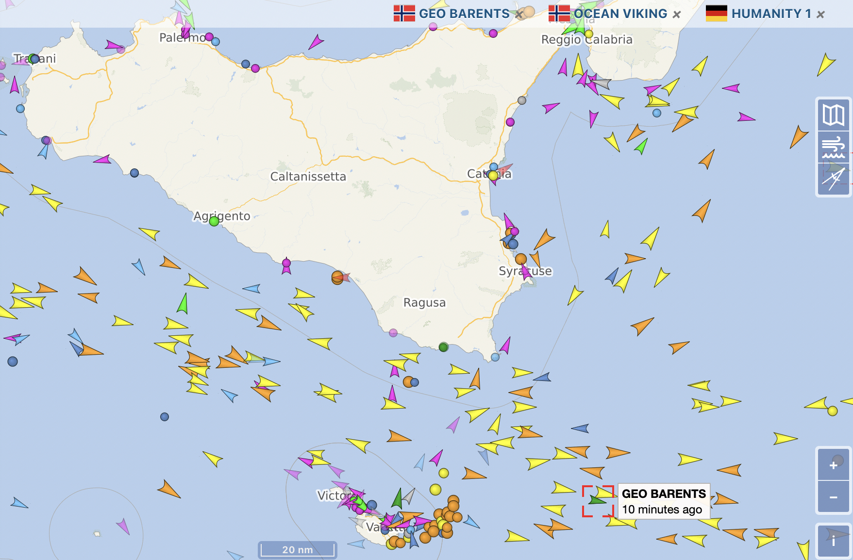 «Geo Barents» ligger nå litt øst for Malta og litt sørøst for Sicilia, på omtrent samme avstand fra de to øyene.