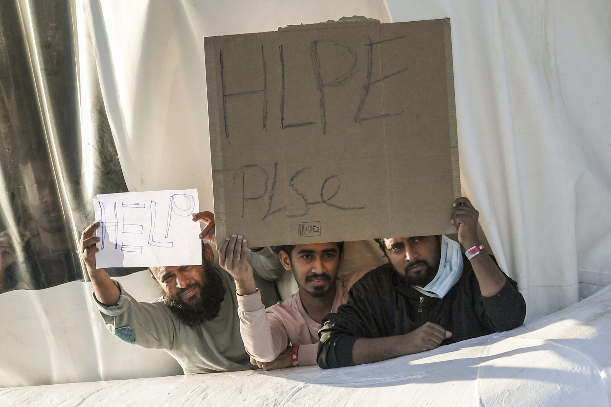 Migranter på «Geo Barents» som ikke får gå i land, ber omverdenen om hjelp på havnen i Catania den 7. november 2022. Foto: Salvatore Cavalli / AP / NTB.