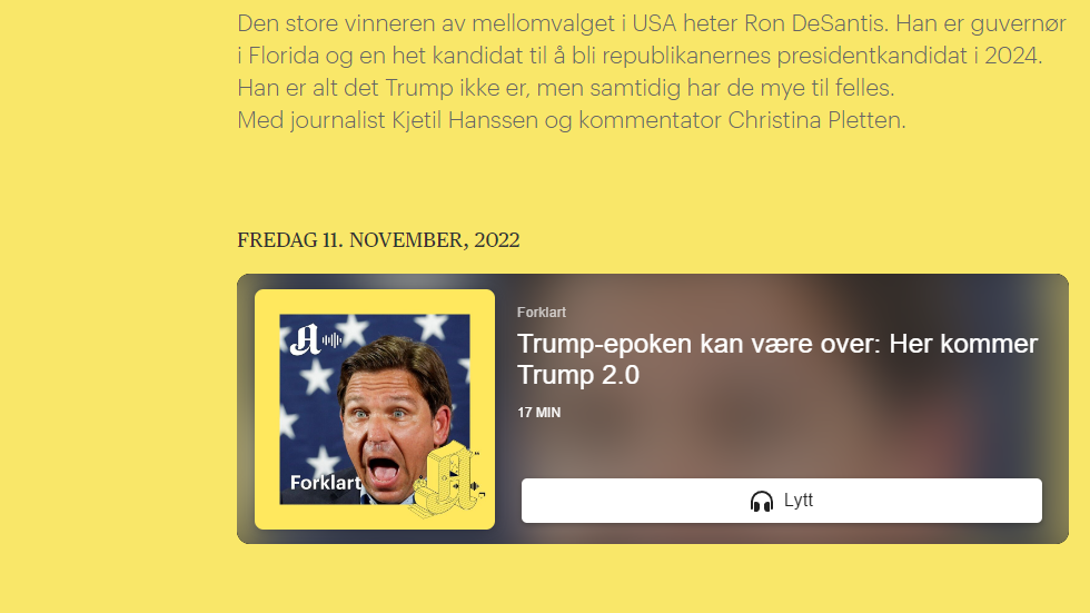 Aftenpostens bildebruk av Ron DeSantis i podkasten «Her Kommer Trump 2.0» signaliserer tydelig den veien norske medier vil følge under dekningen av kampen om Det hvite hus i 2024.