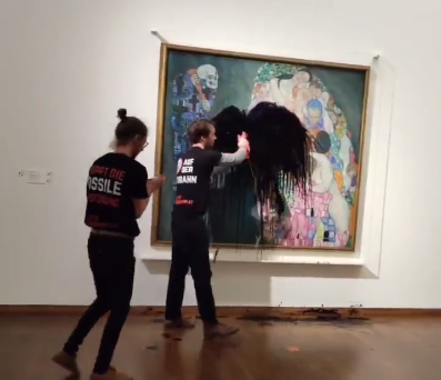 Klimapøbler helte tirsdag en svart væske på et kjent maleri av kunstneren Gustav Klimt. En person forsøkte å lime seg fast til beskyttelsesglasset.