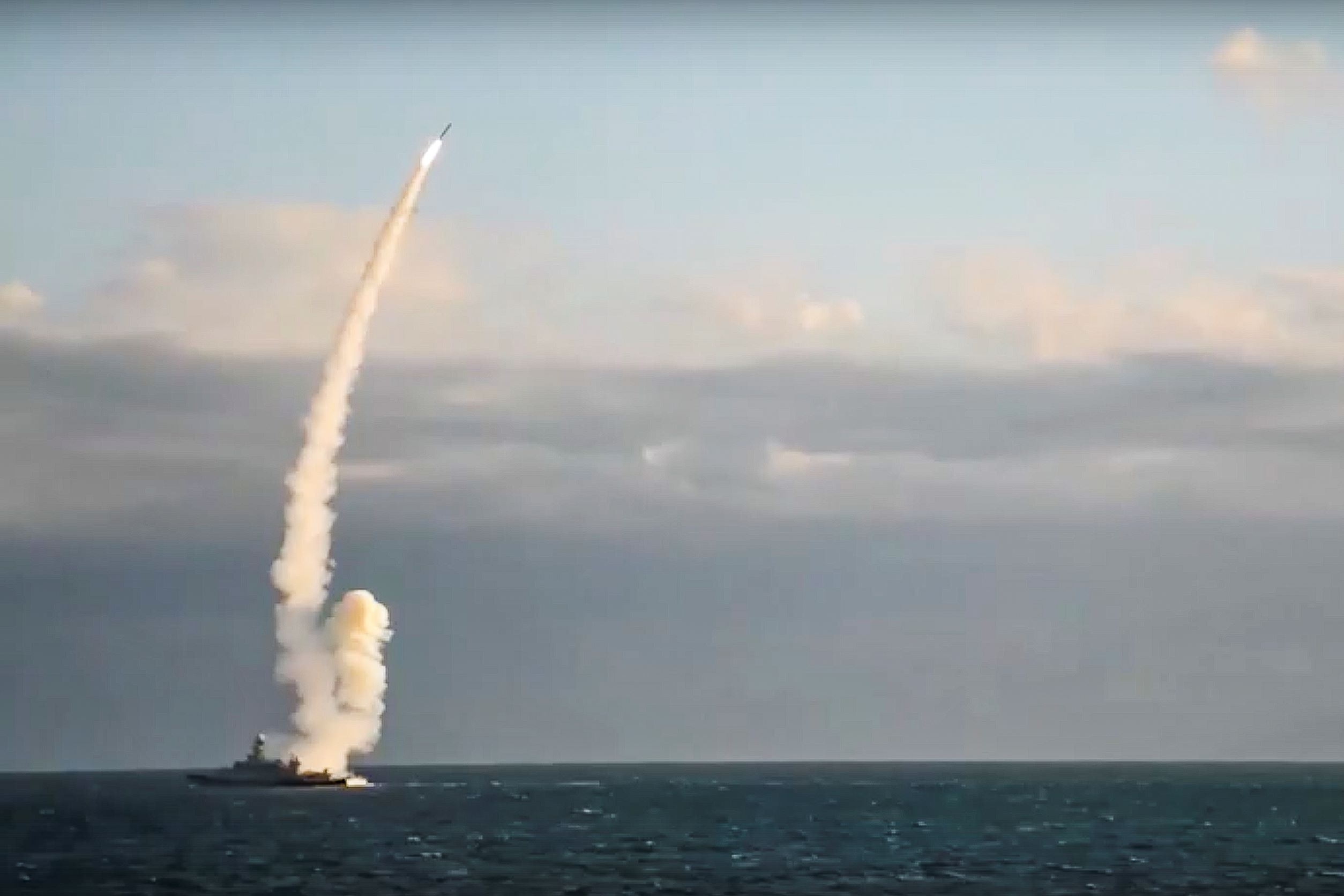 Russisk krigsskip i Svartehavet avfyrer raketter. Foto: Russian Defense Ministry Press Service via AP