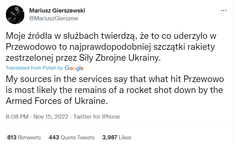 Tirsdag kveld meldte den polske journalisten som først rapporterte om rakettnedslaget i Przewodow, at raketten mest sannsynlig var rester av et russisk missil, skutt ned av ukrainsk luftvern.