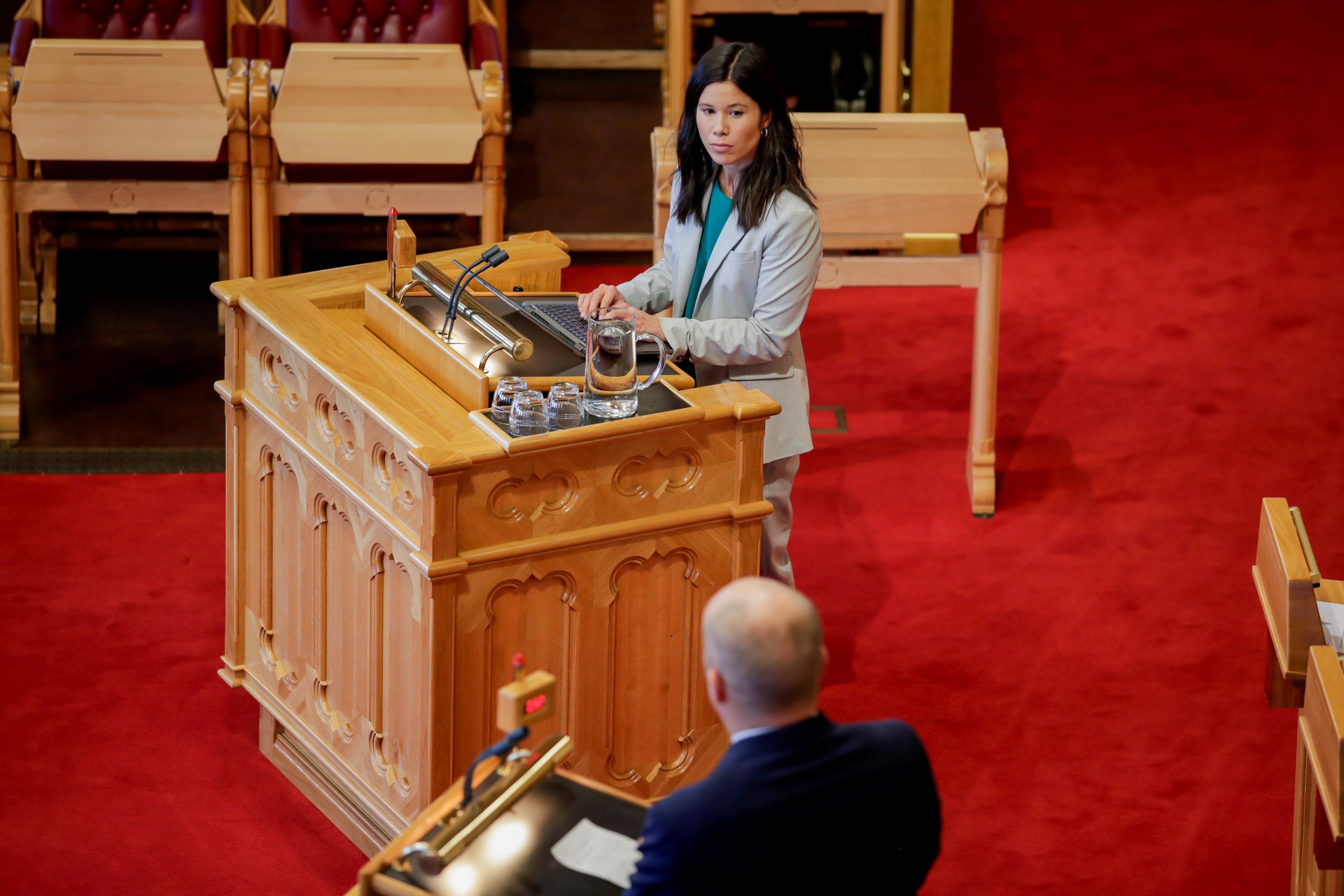 Lan Marie Nguyen Berg (MDG) og finansminister Trygve Slagsvold Vedum (Sp) i Stortinget. Foto: Hanna Johre / NTB