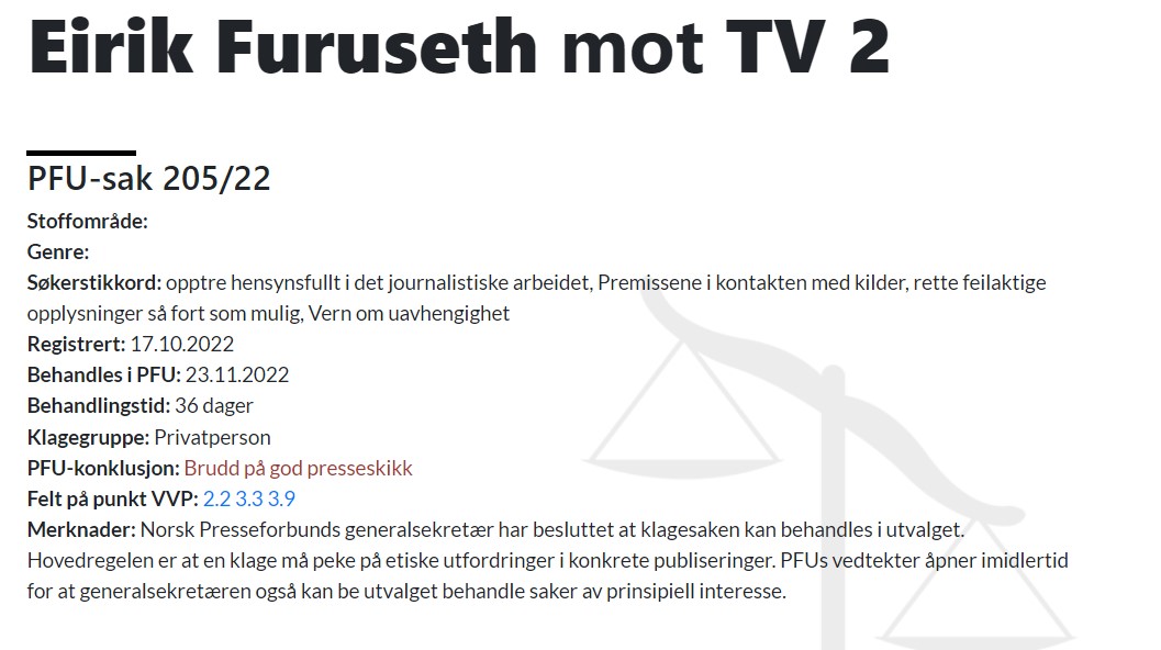 Pressens faglige utvalg (PFU) felte onsdag den profilerte TV2-reporteren Fredrik Græsvik og TV2 for flere brudd på Vær-varsom-plakaten. Klagen var innsendt av finansmannen Eirik Furuseth, som opplevde seg trakassert av at Græsvik blant annet tok kontakt med hans arbeidsgiver, og antydet at Furuseth var en «homofob rasist».
