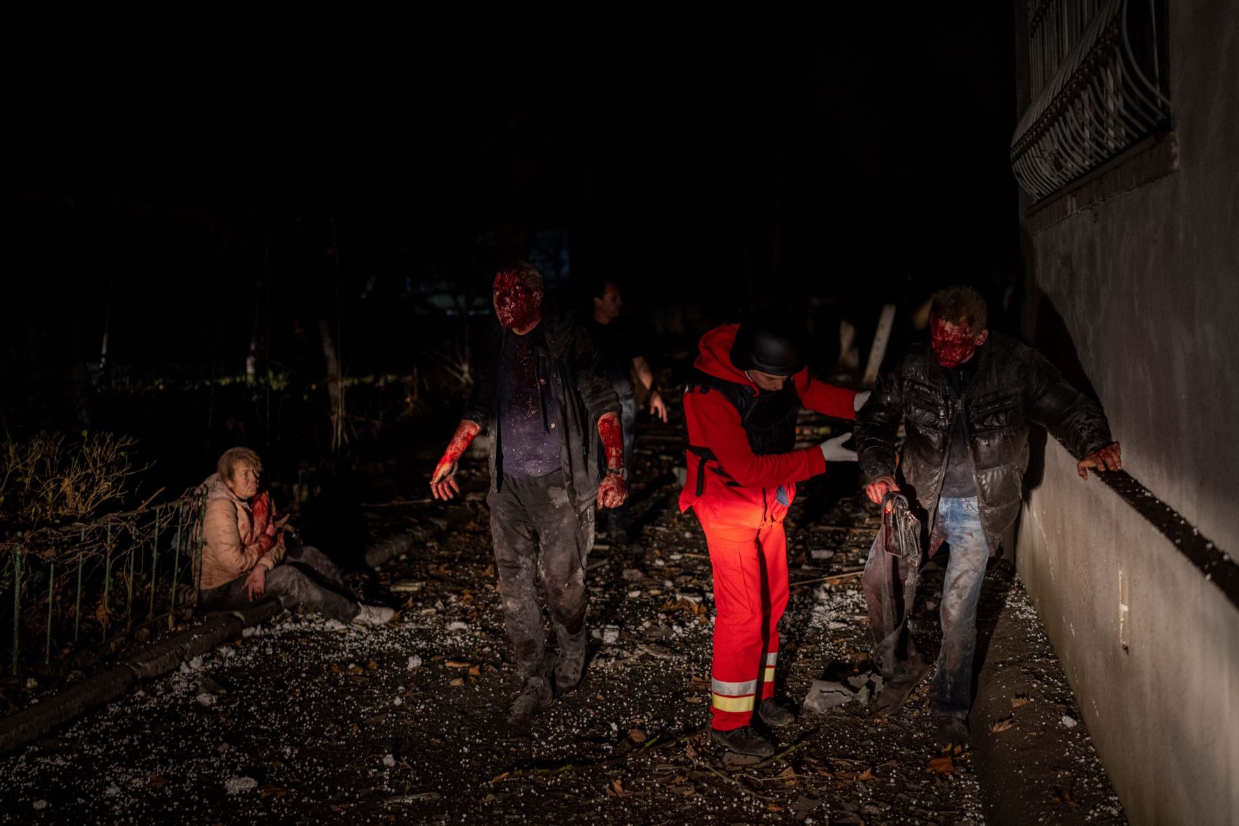A Ukrainian paramedic helps an injured resident moments after a Russian strike in Kherson. (AP Photo/Bernat Armangue)