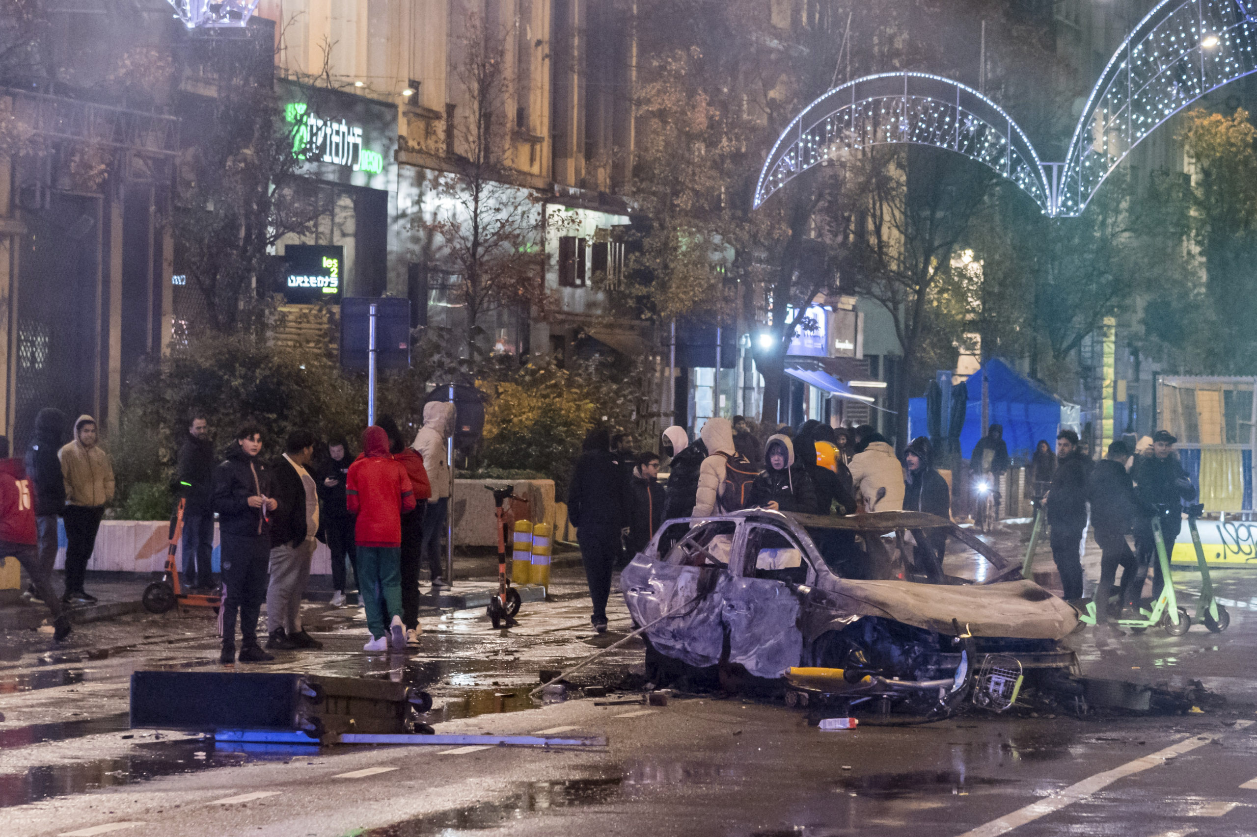 People stand next to a burned out car during riots in Brussels, Sunday, Nov. 27, 2022. Police had to seal off parts of the center of Brussels and moved in with water cannons and tear gas to disperse crowds following violence during and after Morocco’s 2-0 win over Belgium at the World Cup. (AP Photo/Geert Vanden Wijngaert)