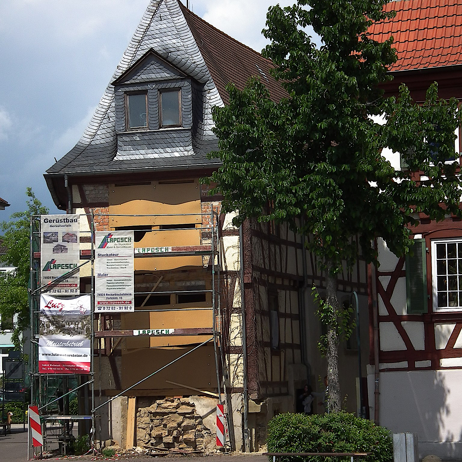 Oppussing av et fagverkhus pågår i sentrum av Sinsheim, Baden-Württemberg. Foto: 4028mdk09 cc by 3.0 / Wikimedia Commons.