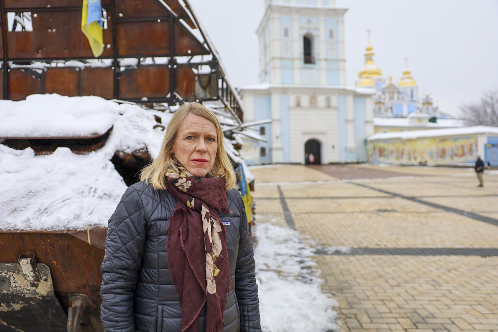 Utenriksminister Anniken Huitfeldt (Ap) er mandag på besøk i den ukrainske hovedstaden. Hun kaller Russlands krigføring «kynisme uten sidestykke».