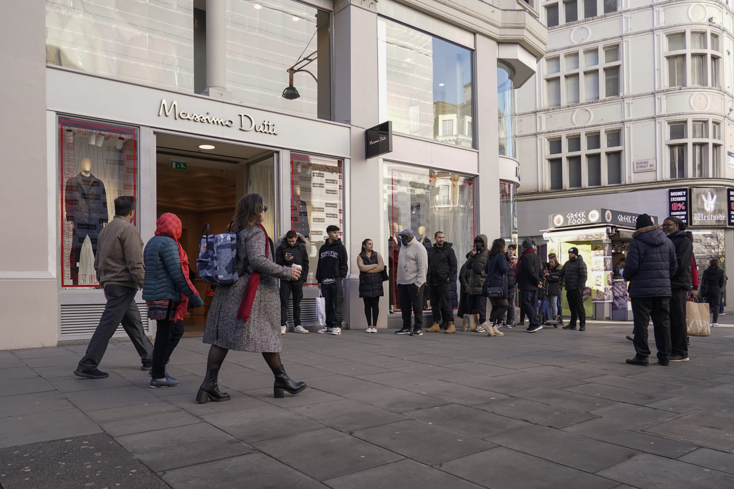 Folk står i kø utenfor en butikk i Oxford Street i London før Black Friday-salget åpnet den 25. november 2022. Foto: Alberto Pezzali / AP / NTB.