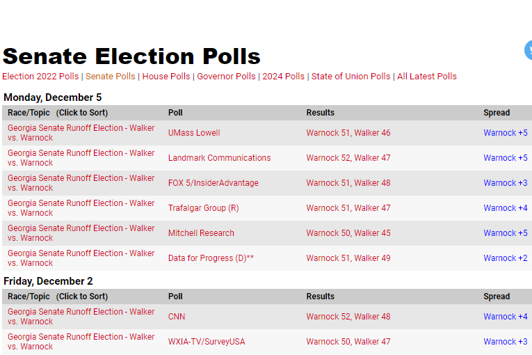 Meningsmålinger indikerer en tett konkurranse med høy valgdeltakelse og viser at Warnock har et lite forsprang over Walker, skriver Bloomberg.