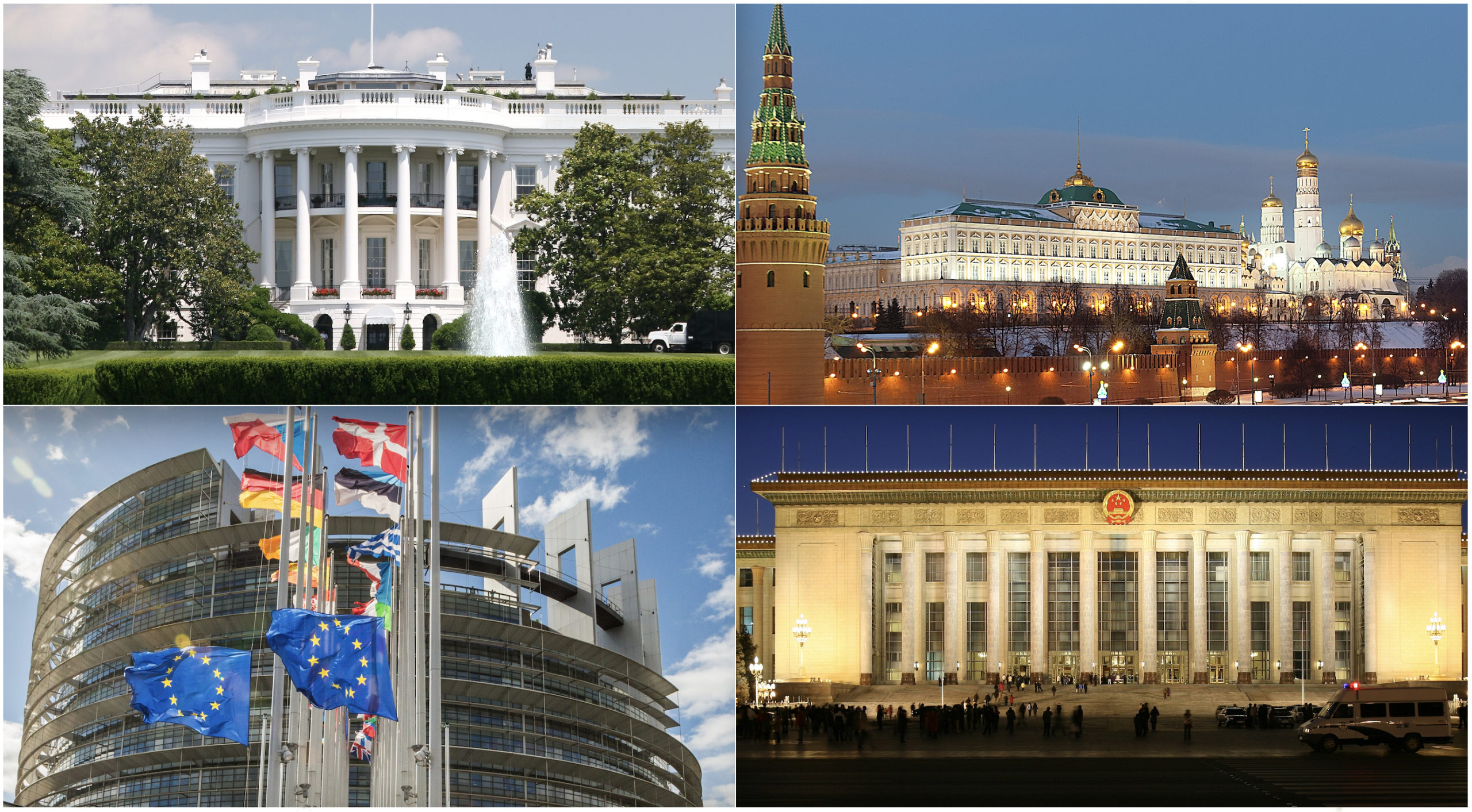 Det hvite hus i Washington, EU-parlamentet i Strasbourg, Kreml i Moskva og Folkets store hall i Beijing. Skvises Europa i dette selskapet? Foto: Daniel Schwen (cc by-sa 3.0), Claude Truong-Ngoc (cc by-sa-3.0), Pavel Kazachkov (cc by-sa-2.0) og Thomas Fanghaenel (cc by-sa-3.0) – alle via Wikimedia Commons.