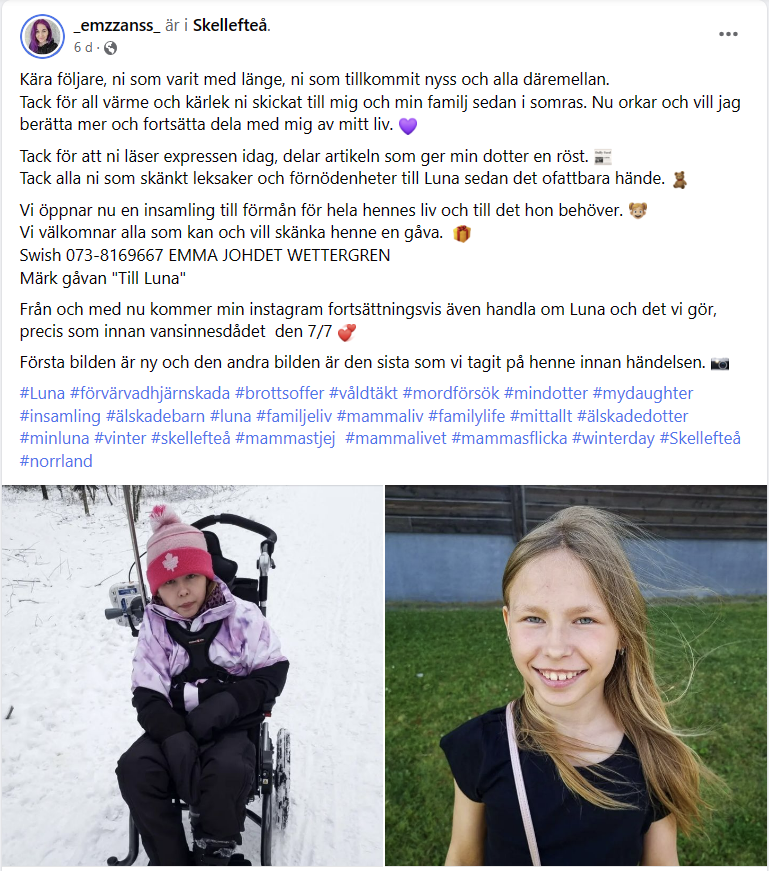 Etter at både Expressen og Aftonbladet publiserte familiens historie, valgte Lunas tante derfor å starte en innsamling til fordel for Luna. På sosiale medier takker Lunas mor Emelie alle som har støttet familien i disse månedene og oppfordrer de som kan til å gi penger til Luna, slik at hun kan få den hjelpen hun trenger for å leve et så normalt liv som mulig.