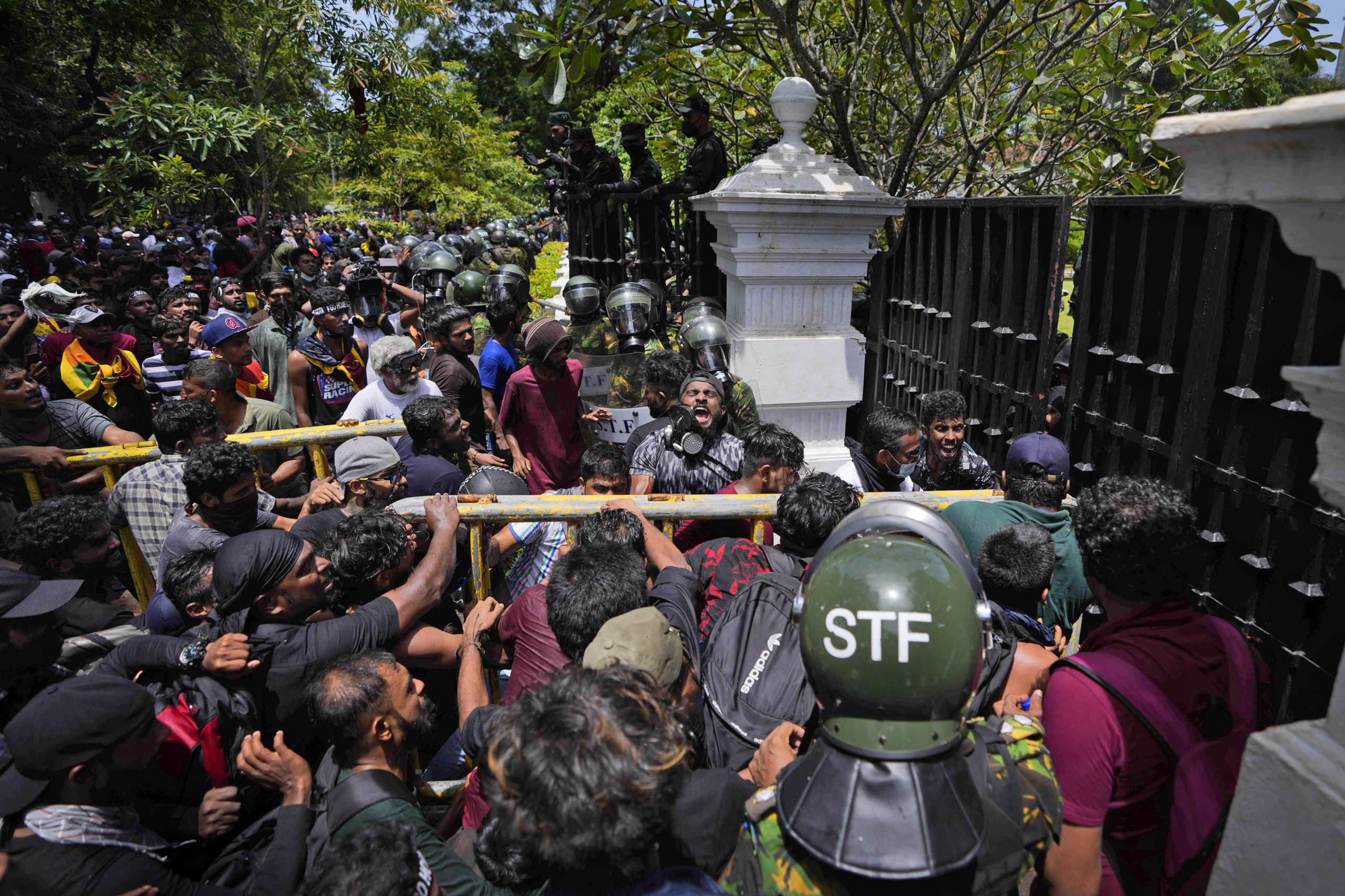 Rasende demonstranter angriper boligen til den nåværende presidenten på Sri Lanka, Ranil Wickremesinghe, den 13. juli i år. Demonstrantene er rasende over at han lot den tidligere presidenten, Gotabaya Rajapaksa få rømme landet uten å bli stilt til ansvar. Foto: AP/Eranga Jayawardena
