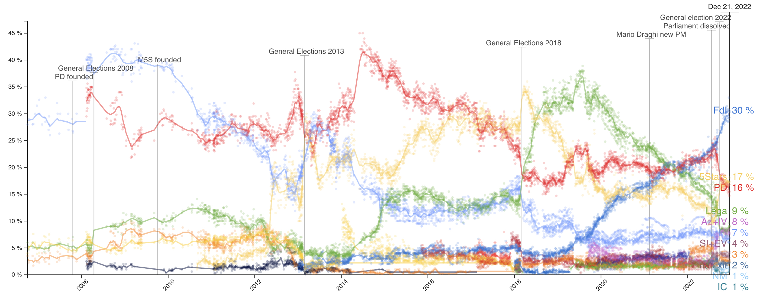 Det politiske landskapet i Italia har de siste tiårene sett mange partier og ledere vokse til himmels for siden å dale raskt ned igjen, det være seg Forza Italia med Silvio Berlusconi, Det demokratiske partiet med Matteo Renzi, Fem stjerner med Beppe Grillo eller Lega med Matteo Salvini.