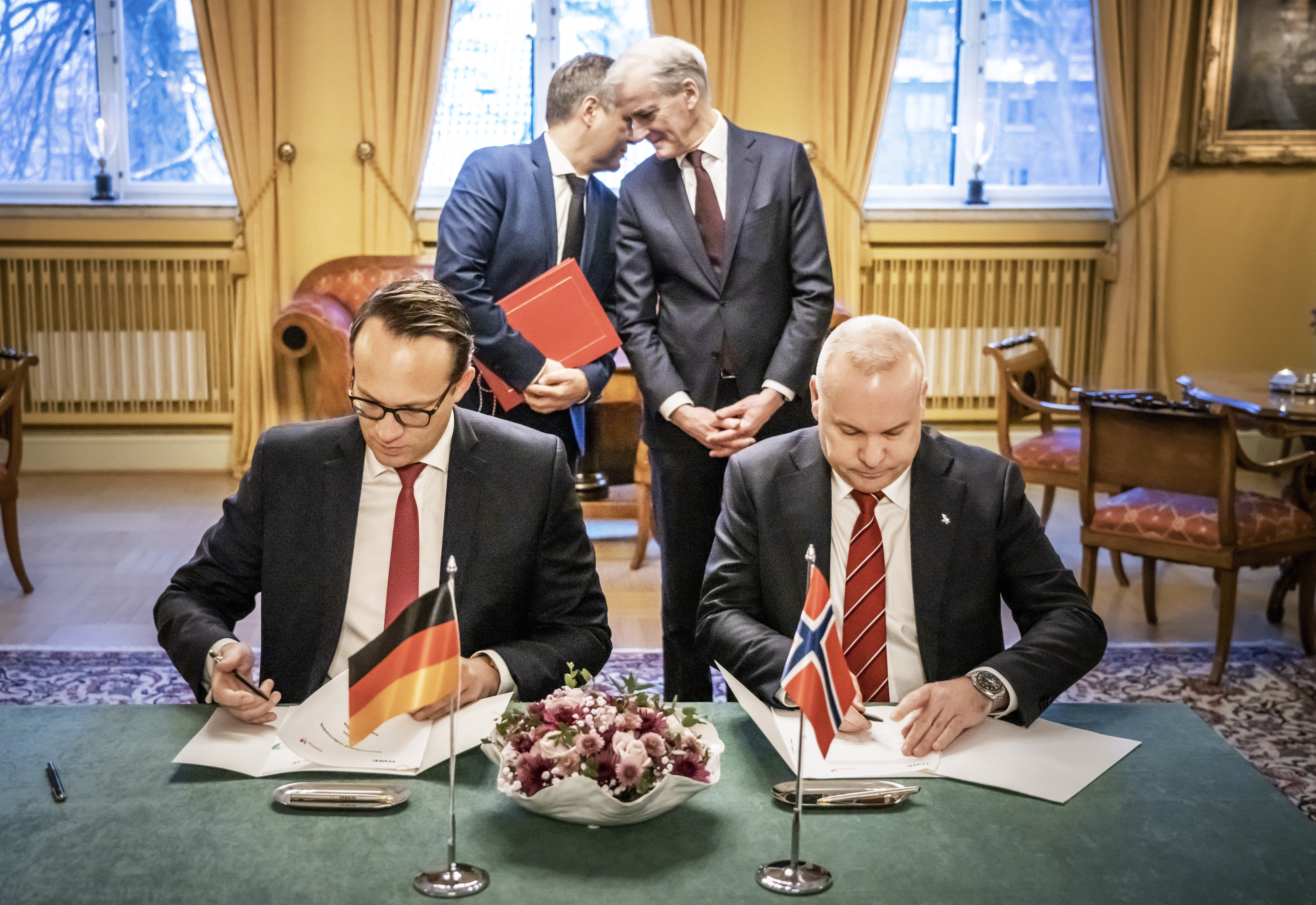 Equinor-sjef Anders Opedal og Markus Krebber i RWE signerer en avtale om samarbeid om hydrogenproduksjon og -eksport i Oslo 5. januar 2023. Jonas Gahr Støre er også med. Foto: Ole Berg-Rusten / NTB.