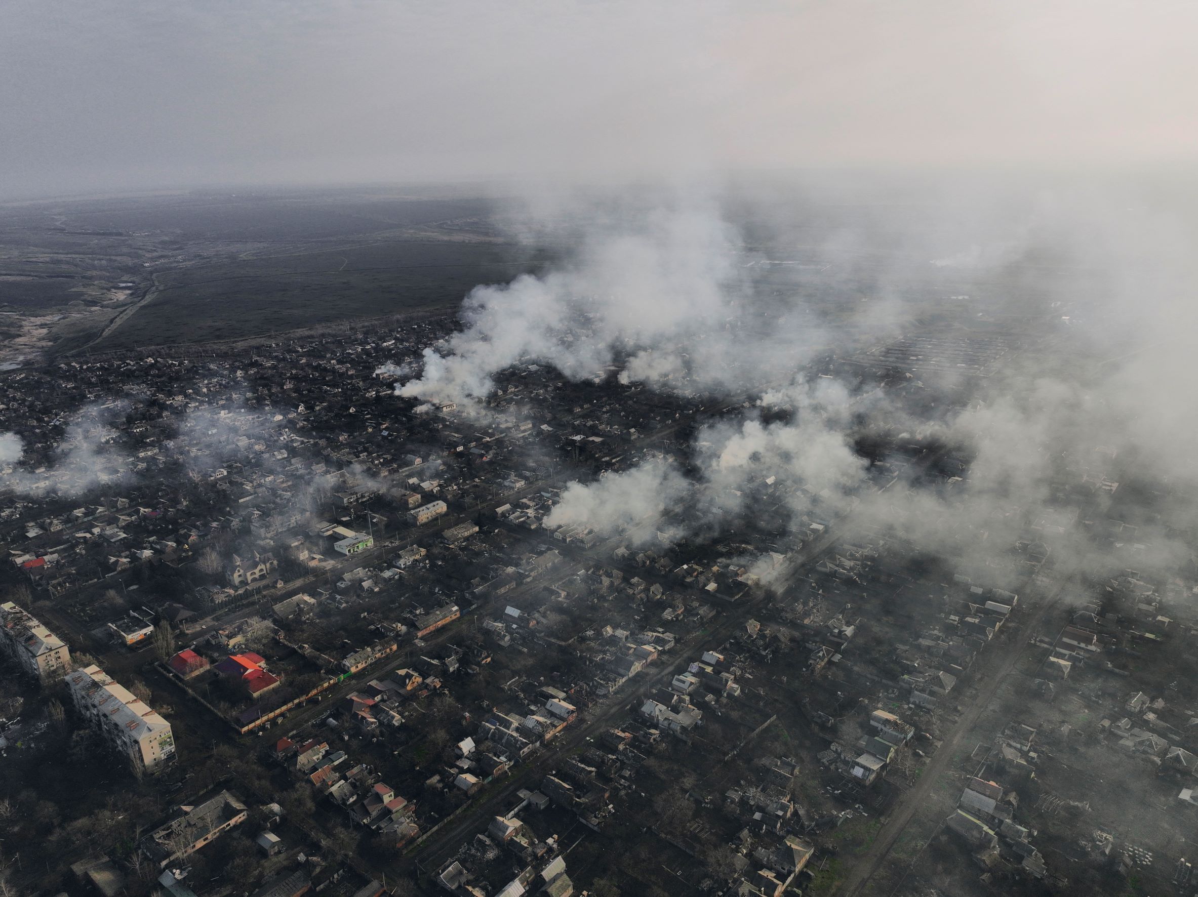 Russiske angrep mot den ukrainske byen Bakhmut. Foto: AP Photo/Libkos