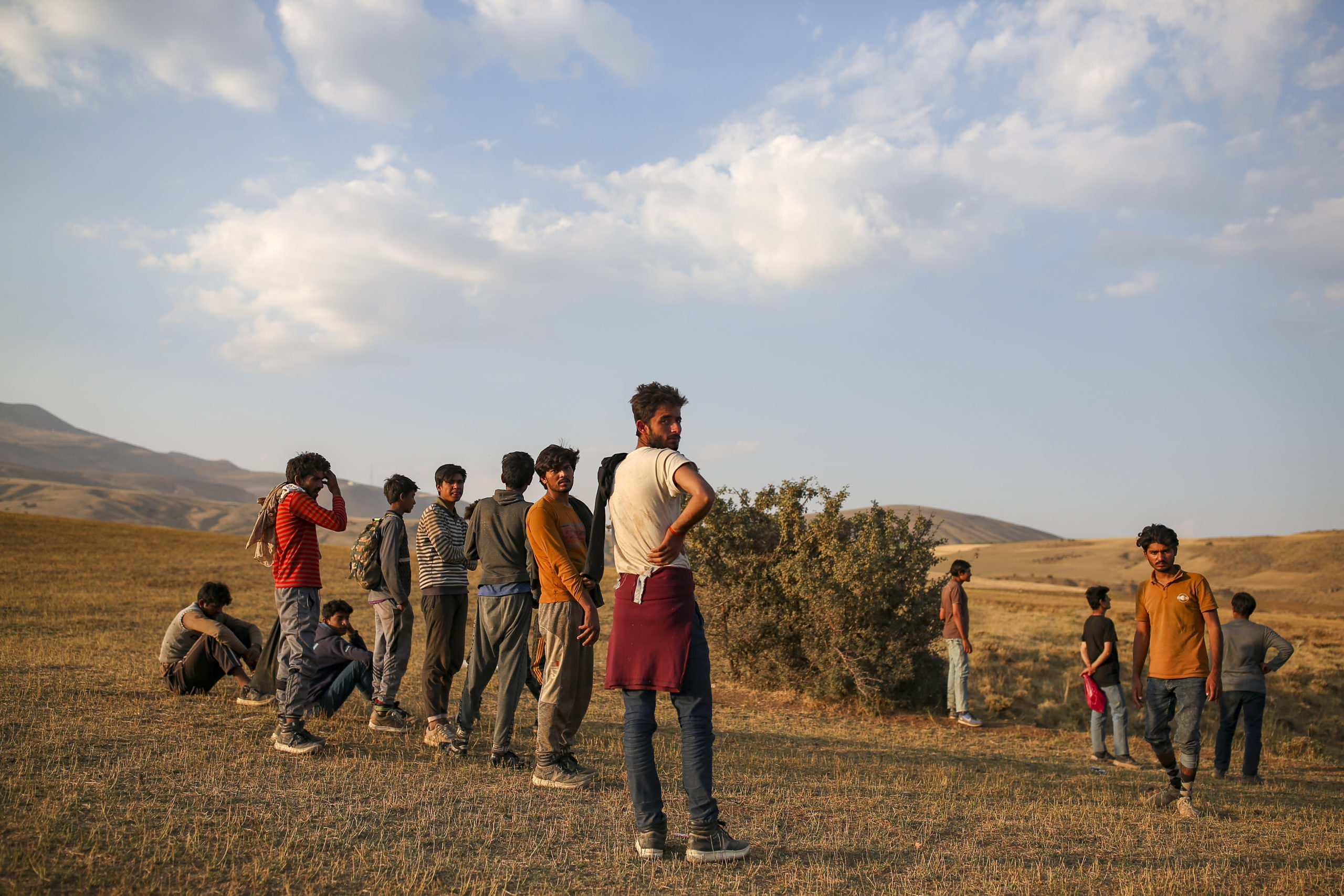 Unge menn som sier de har desertert fra militæret i Afghanistan og flyktet derfra via Iran, befinner i nærheten av Tatvan i den østlige tyrkiske provinsen Bitlis den 17. august 2021. Foto: Emrah Gurel / AP / NTB.