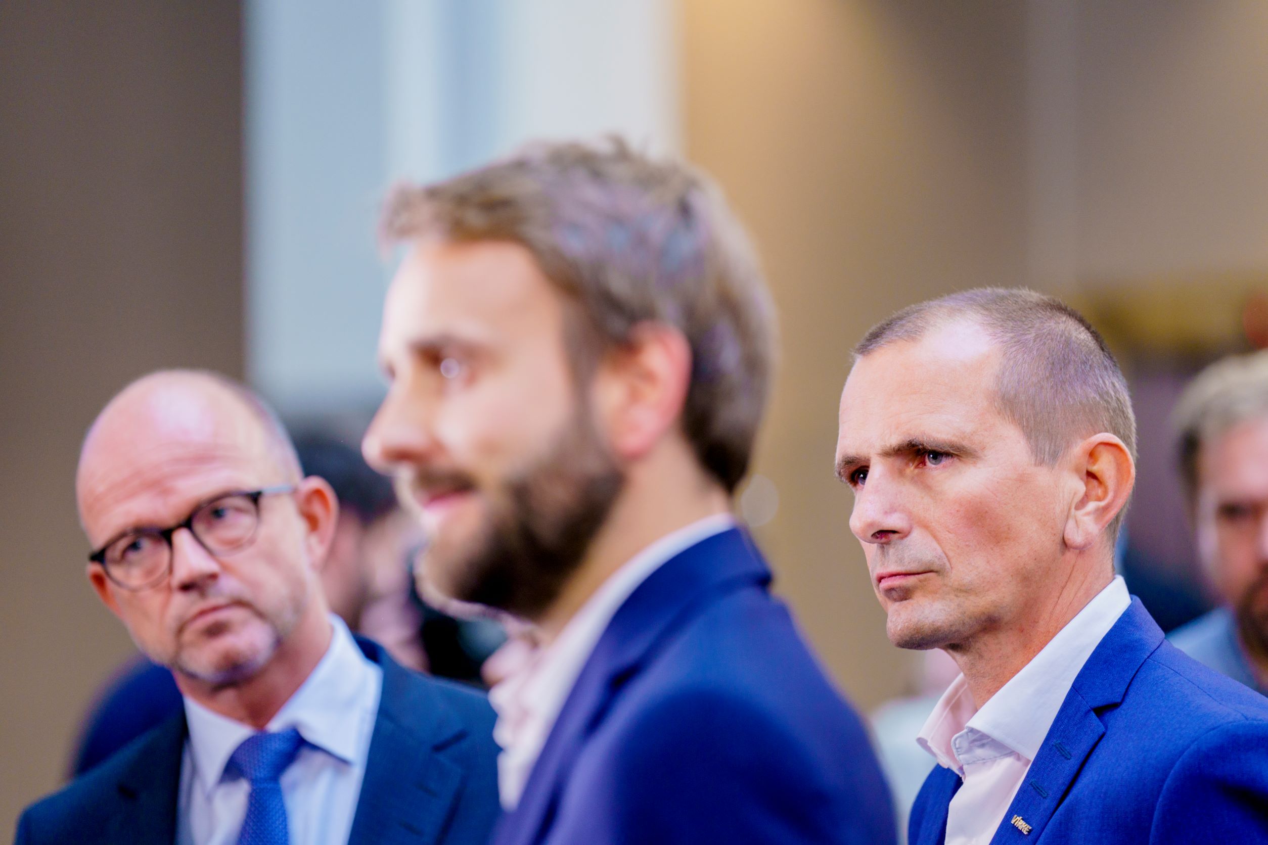 NHO leder Ole Erik Almlid, næringsminister Jan Christian Vestre og Stian Sigurdsen, direktør i samfunnspåvirkning i Virke. Foto: Stian Lysberg Solum / NTB