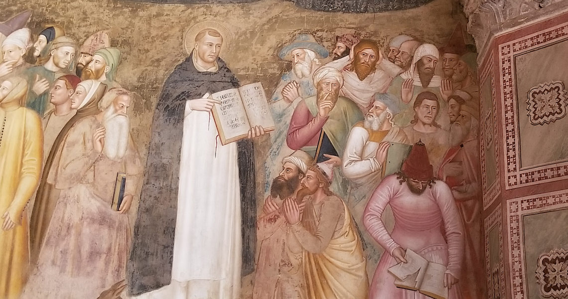 Andrea di Bonaiuto (1319–1377). Thomas Aquinas (1225–1274) preker til de vantro, detalj fra Allegori over den militante og triumferende Kirken (1365-67), freske på veggen i det spanske kapellet i klosteret ved Santa Maria Novella-kirken i Firenze. Foto: Christian Skaug / Document.