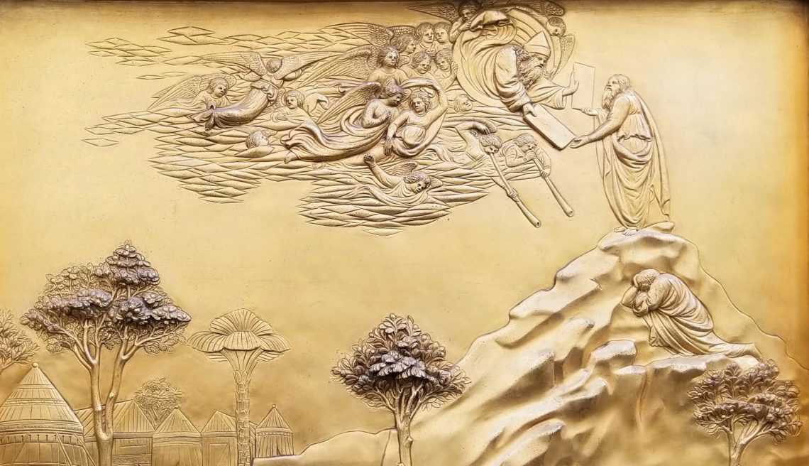 Moses mottar de ti bud på Sinai. Kopi av bronserelieff av Lorenzo Ghiberti (1378–1455) i Porta del Paradiso, døren på østsiden av dåpskapellet ved domkirken i Firenze. Foto: Christian Skaug / Document.