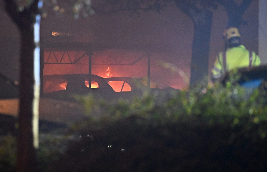 Tre biler ble påtent i en garasje i Malmö natt til lørdag. Brannen førte til røykskader på rundt 80 biler og spredte seg til tre oppganger.
