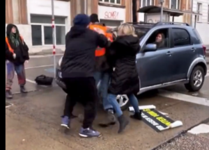 Også i Wien prøver klima-ekstremister å stanse trafikken i byens gater, og en gruppe limte seg fast i veibanen. Men her fikk bilistene nok, og røsket dem bort.